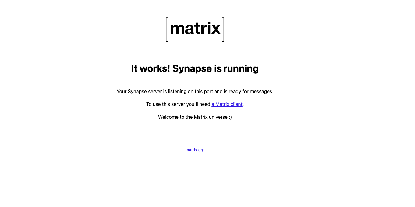 打开浏览器,输入你部署Synapse机器的ip地址,如http://192.168.1.1:8008,如果出现以下界面,那么恭喜你,你的Synapse服务已经部署完成